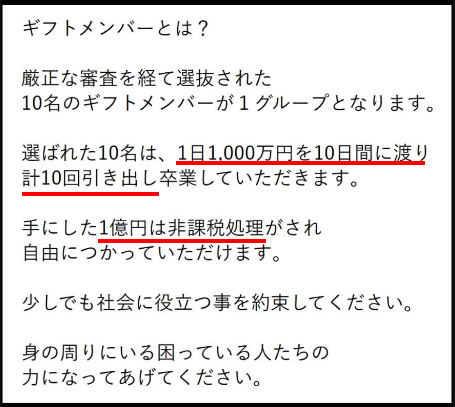 最終的に案内された「ギフト」というアカウントから、1000万円を10回に分けて振り込む、しかも無税と案内がありました。