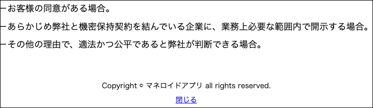 上記以外(法的な場合を除く)につきましては、当サービスは、お客様の事前承認なくお客様の個人情報を第三者に開示・提供することはありません。