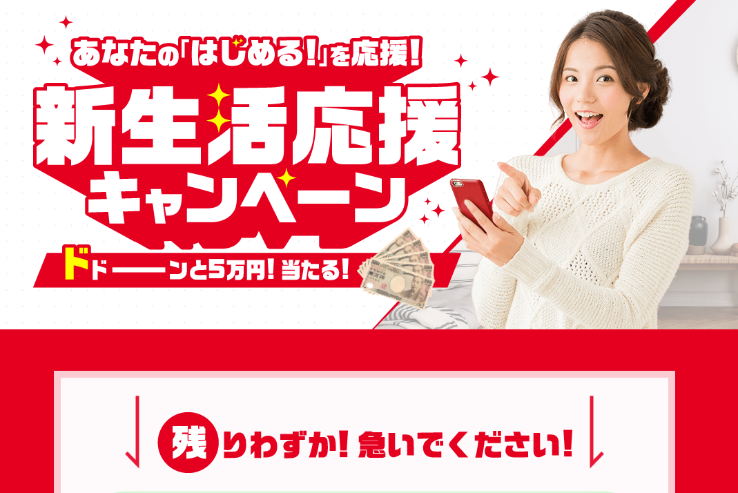 あなたの「はじめる!」を応援!新生活応援キャンペーンドドーンと5万円!当たる!と言う感じで、抽選系のLPですね。